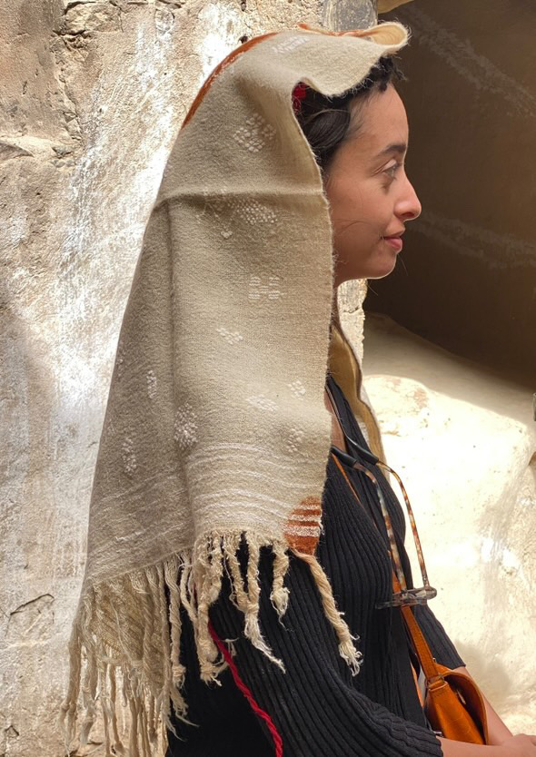 Un matin, les villageoises nous exposent leurs plus précieux morceaux de textile: leurs voiles de mariées. Des carrés de laine peints de motifs à la henna. Chacune confectionne le sien pour ses noces. La couleur rouge ocre ondule d’intensité, tantôt d’un orange pâle, tantôt tirant vers le carmin.