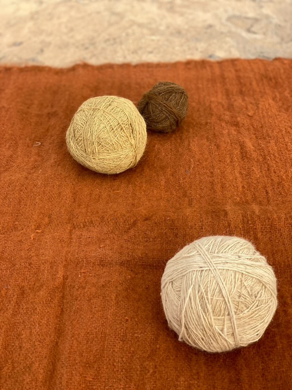 Nous avons plongé les mains dans les pigments. À part la henna, les fibres naturelles sont teintes avec des fragments de nature: des peaux de grenades séchées, de la poudre de garance, des écorces de noix. Les poudres se diluent et mijotent dans des cocottes en fonte sur un feu de bois avant d’y submerger les boules de laine.