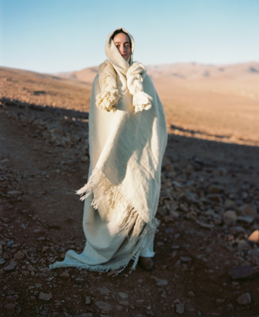 À bord de notre minibus, nous voyons le paysage défiler direction sud, je regarde de ma fenêtre: la terre couleur cramoisie, la végétation comme une dentelle décorant les flancs des collines. Ma première fois au sud du Maroc. À bord de notre fragile véhicule, nous parcourons des kilomètres et des kilomètres. Notre chauffeur s’arrête gracieusement pour prendre les autostoppeurs, des hommes habillés de tuniques d’un bleu profond. Les arbres se font de plus en plus rares, leurs formes deviennent étranges, elles sont sèches, craquelées, comme des ombres préhistoriques La route se prolonge sur une infinité de pierres et de cailloux. La terre rouge laisse place à de la roche. Nous nous enfonçons dans ce qui semble être le fond d’une grotte à ciel ouvert. Après plusieurs heures, le véhicule poussiéreux remonte le flanc d’une colline, nous sommes enfin arrivés à destination.