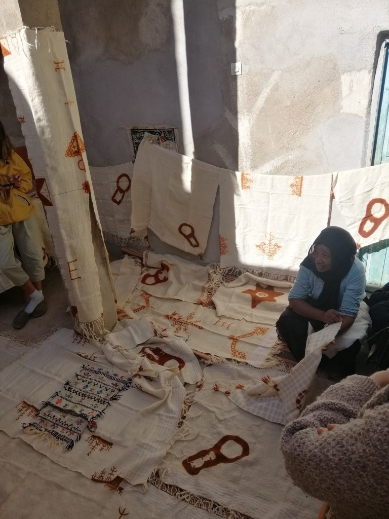 Et puis on se rejoint sur la place commune lorsque le déjeuner est terminé. Tisser dans nos grottes à l’abri du vent et de la chaleur, collées serrées, échangeant quelques mots d’arabe et apprenant quelques mots amazighs. C’est devenu mon moment préféré, toute l’attention posée sur le geste, le contexte, la poésie. Dans la simplicité, en chaussettes, posées en tailleur devant le métier et les instruments en argent massif comme le grand peigne utilisé pour tasser les fils de laine. Le rythme du tissage est un rythme commun. Les petites filles et petits garçons viennent jeter un coup d’œil, restent avec nous un moment.