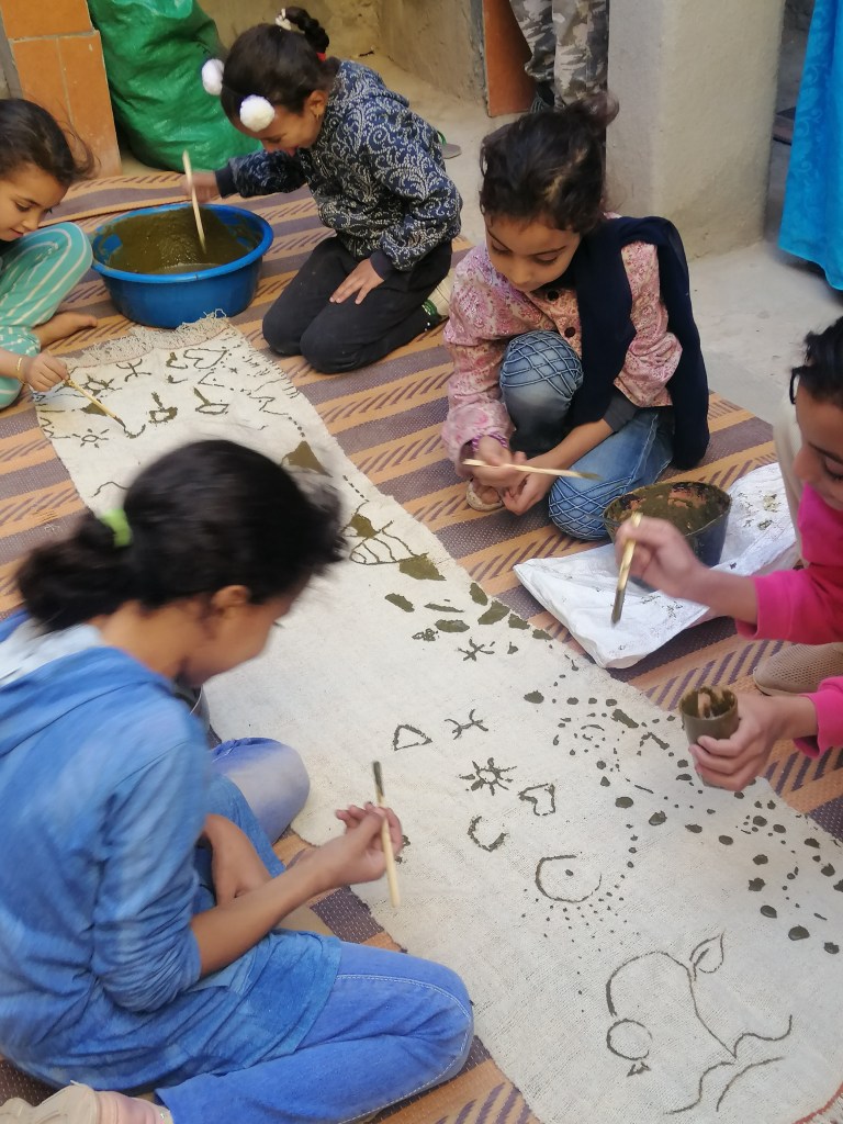 Les enfants nous accueillent chaleureusement dans leur village. Ils s’adonnent au jeu qu’on leur propose avec beaucoup de joie: peindre une fresque au henné sur un grand morceau de laine posé sur le sol de l’école. Nous dessinons tous ensemble, nos rêves, nos références, nos endroits préférés.